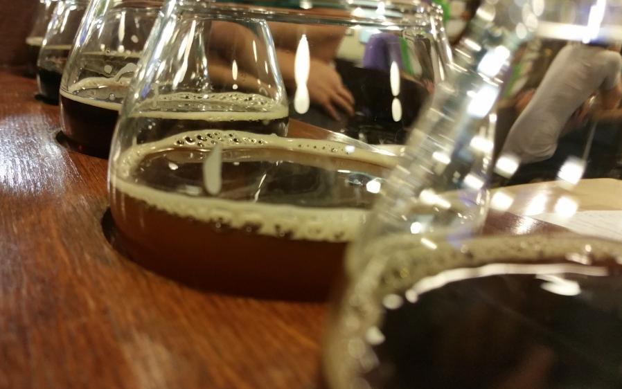 So, I recently went and one thing that proved difficult was finding street parking, of which there are only several spots nearby. Fortunately, I was able to find a spot a couple of streets away. I then seated myself at the bar and, as is my typical move at a brewery, I ordered a flight of beers. Belmont Brewing Company’s flight of six beers goes for $6.50 and are in short glasses arranged on the perimeter of a circular platter. In a clever move of convenience, underneath each taster glass is the name of each beer as well as a brief description. I definitely thought that was a smart move, so that both customers don’t have to keep asking the bartenders what each beer is and so that the bartenders don’t have to keep answering that question.
